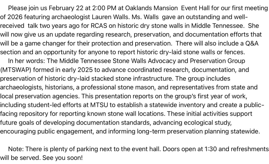 Update on Middle Tennessee Stone Walls by Archaeologist Lauren Walls!